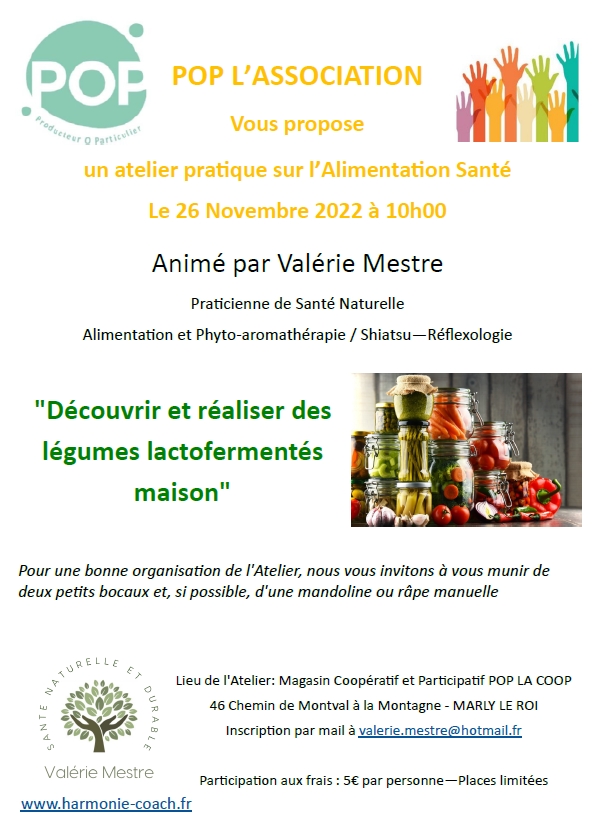Ornagnisé par POP l’Assocation, cet atelier a permis aux 12 participants de découvrir le procédé de lactofermentation aujourd’hui utilisé dans le cadre de l’alimentation santé. Après une présentation théorique de cette technique et de ses bienfaits sur la santé, par Valérie Mestre, coopératrice et praticienne en santé naturelle et en thérapies manuelles sur Marly le Roi, chacun a pu passer à la pratique en fabriquant un bocal de légumes lactofermentés pour s’initier à la méthode.
