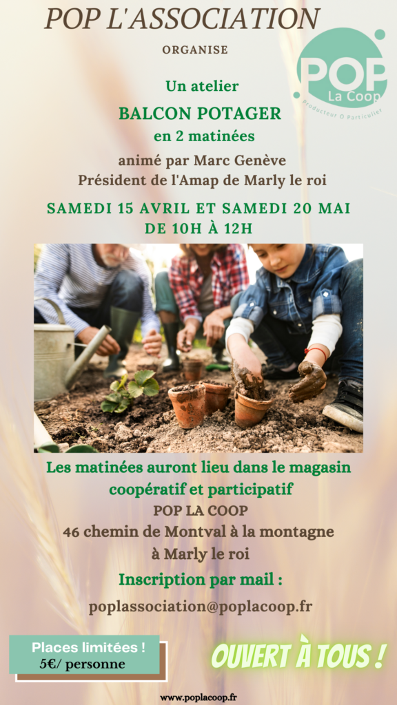 Les ateliers auront lieu au magasin coopératif et participatif POP LA COOP, 46 chemin de Montval à la montagne à Marly le Roi
